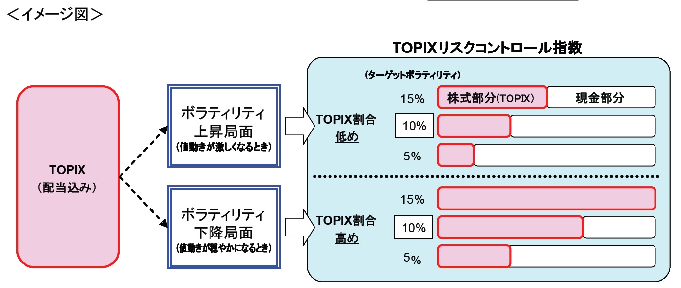 TOPIXリスクコントロール指数は、TOPIXとキャッシュの可変ウェイトで構成され、エンハンスト型指数(一定の投資成果を実現するための投資戦略を表現した指数)の一種とされています。