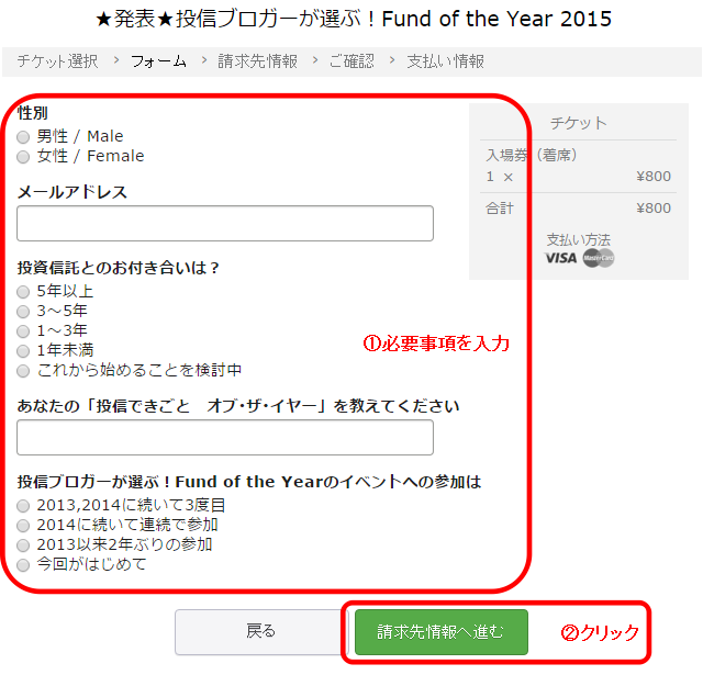 6.①性別、メールアドレスなど必要事項を入力、②「請求先情報へ進む」をクリック