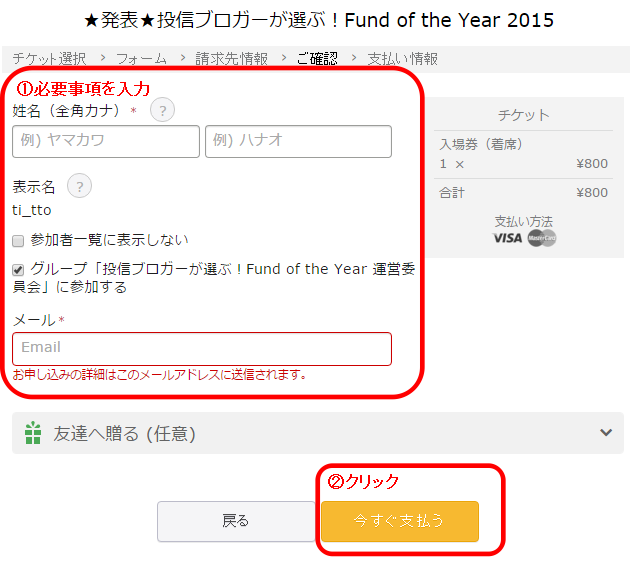 8.①姓名、メールアドレスなど必要事項を入力、②「今すぐ支払う」をクリック
