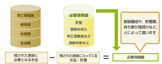 必要保証額=支出(葬儀費用+教育費+生活費)-収入(貯蓄+妻の収入+遺族年金)