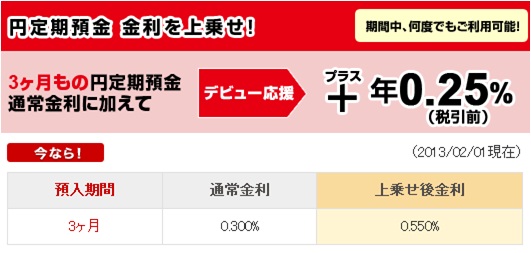 2013/02/01現在 3ヶ月円定期預金金利: 0.30% + 0.25% = 0.55%