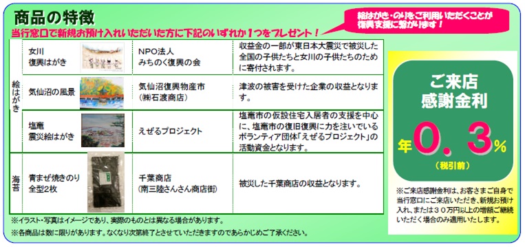ご契約いただいた方に、東日本大震災で被災した地域の絵はがきや特産物を
