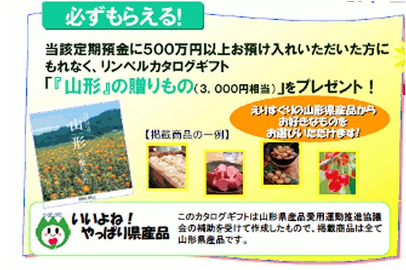| 商品名 | 経営統合記念 ネット支店専用「山形ギフト付定期預金」 |