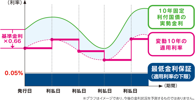 | 利率 | 発行時の利率は発行月、銘柄により異なり、利率は半年毎に変わります(変動金利)。 適用利率は「基準金利×0.66」で0.05%を下回る場合は0.05%になります(最低金利保証) |