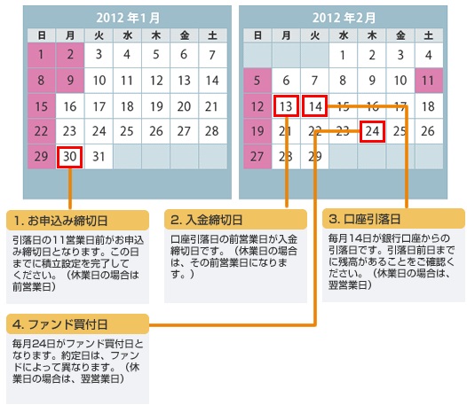 毎月14日の11営業日前までに積立設定、毎月14日に銀行口座引落、翌月24日の買付け