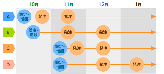 A、B、C、D いずれのパターンで積立設定・約定しても、キャンペーン対象